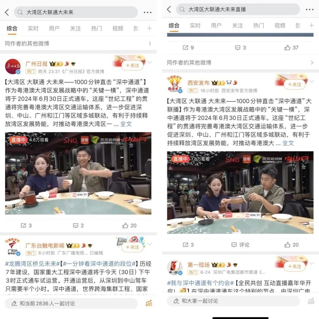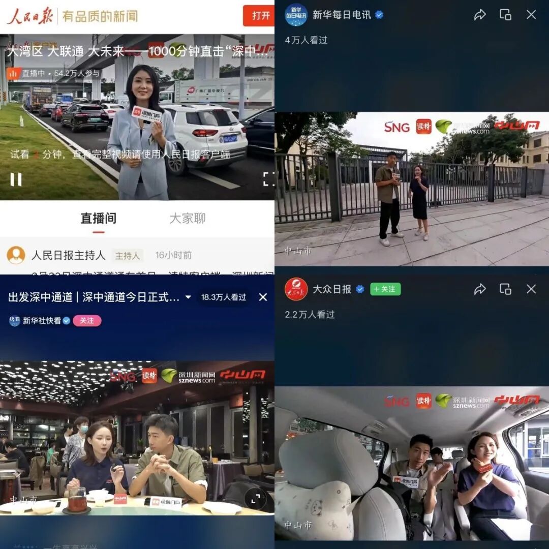 直播期間,人民日報、新華社每日電訊、新華社快看、新華財經(jīng)客戶端、環(huán)球時報等多家央媒新媒體平臺在首頁等重點(diǎn)位置推出;北京日報、北京青年報、京彩臺灣、極目新聞、東南網(wǎng)、海南日報、大眾日報等多家主流媒體平臺持續(xù)聯(lián)動;香港商報等港澳媒體更是通過Facebook、YouTube等國際傳播平臺向全球推送,吸引了眾多海內(nèi)外網(wǎng)友跟隨直播的鏡頭,一起感受深中通道的宏偉身姿和通車首日的熱烈氛圍,感受大灣區(qū)的大聯(lián)通、大未來。